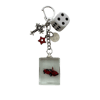 1 keychain - deadstock vintage (early 00s) heavyweight glass block w/ car + girl, silver lobster clasp, silver drop chain, white & black vintage dice hand drilled, vintage silver cross w/ rhinestone, silver rhinestone star charm, transparent button